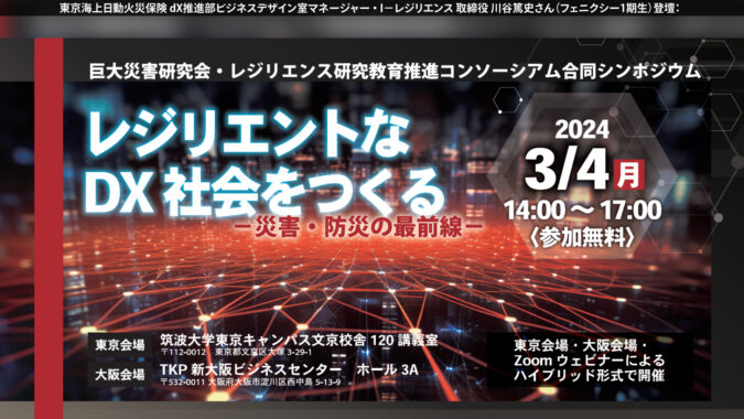 【開催案内 3/4】巨大災害研究会・レジリエンス研究教育推進コンソーシアム合同シンポジウム(登壇:東京海上日動・I-レジリエンス・フェニクシー1期生 川谷篤史)