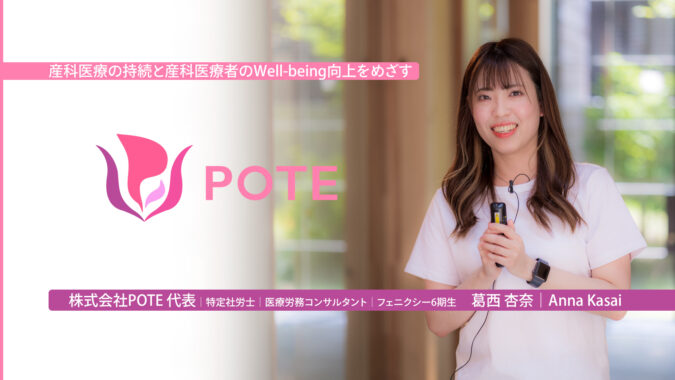 葛西杏奈さん(フェニクシーインキュベーションプログラム6期生)は7月5日、産科医療の持続と産科医療者のウェルビーイング(身体的・精神的・社会的に良好な状態)向上の両立をめざす株式会社POTEを設立しました。同社は、新人助…