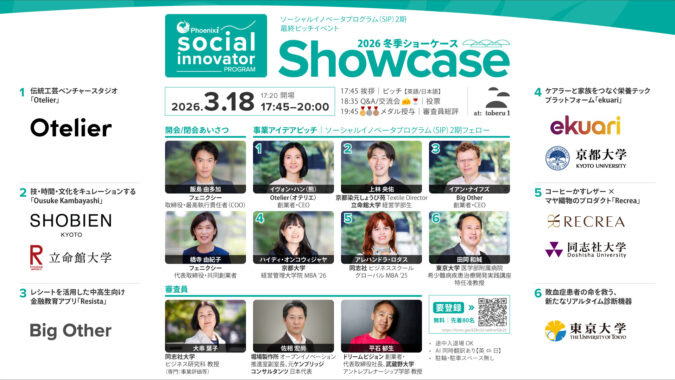 「大企業発ベンチャー」と起業人材を育成する株式会社フェニクシー(京都市、代表取締役:橋寺 由紀子)は3月18日、同社ソーシャルイノベータプログラム(SIP)2期の最終ピッチイベント「2026冬季ショーケース」を、居住滞在…