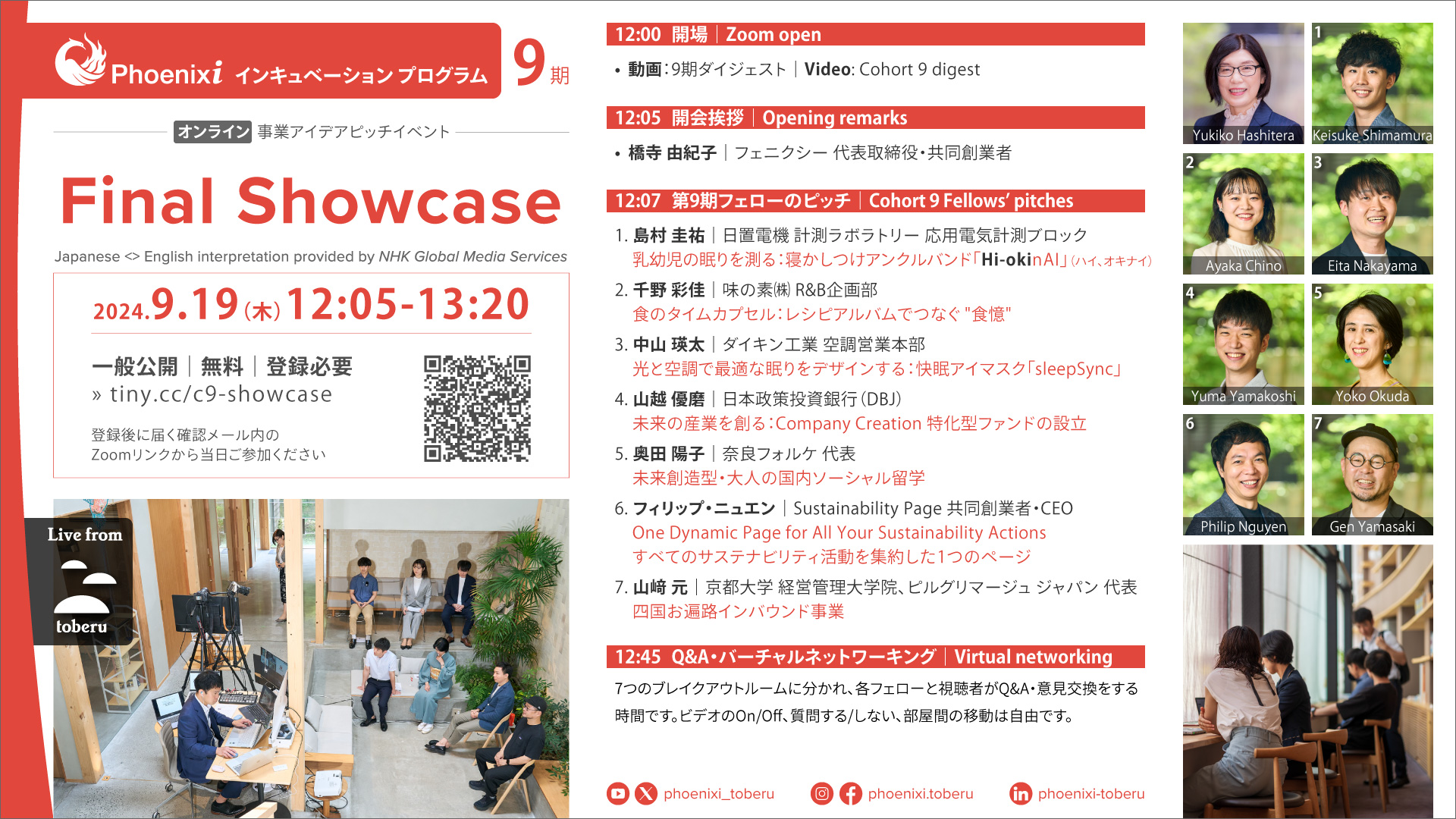 株式会社フェニクシーは9月19日、同社インキュベーションプログラム第9期の最終ピッチイベント「ファイナルショーケース」を、オンラインで開催します。第9期フェロー(プログラム参加者)7名がフェニクシー施設「toberu」で4か月間かけて磨いた各自の事業アイデアを発表します。一般公開、無料のイベントです。多くのご参加をお待ちしています。
