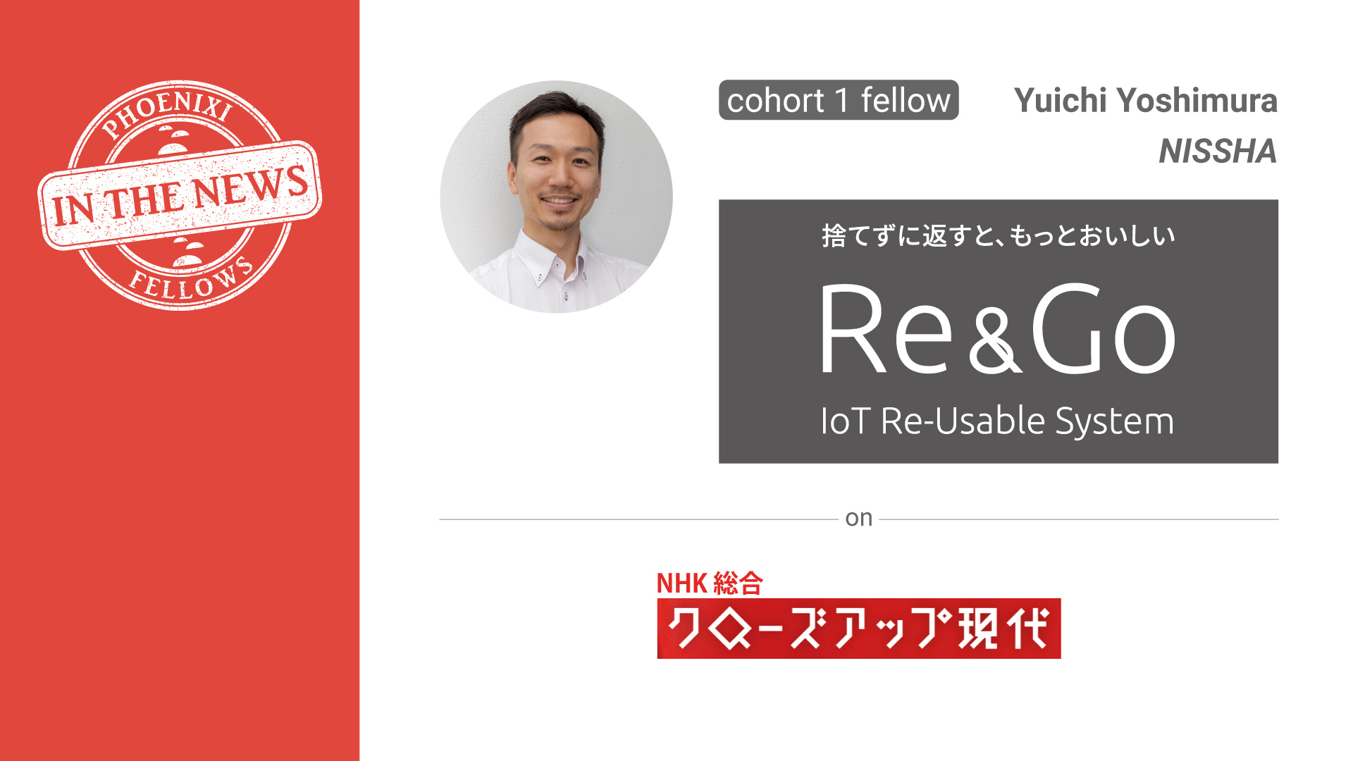 2022年10月24日放送のNHK総合「クローズアップ現代:それ本当にエコですか?徹底検証!暮らしの中の環境効果」で、NISSHA株式会社のテイクアウト容器シェアリングサービス「Re&Go(リーアンドゴー)」が紹介されます。同サービスは、株式会社フェニクシーのインキュベーションプログラム第1期に参加したNISSHA社員、吉村祐一さんによる「プラスチックごみ削減」に向けた事業アイデアがベースになっています。
