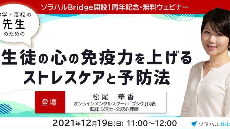 12月142021 【開催案内 12/19】ソラハルBridge開設1周年記念無料ウェビナー『生徒の心の免疫力を上げるストレスケアと予防法』(フェニクシー3期生 北村健創業 株式会社ソラハル共同主催イベント) Read more