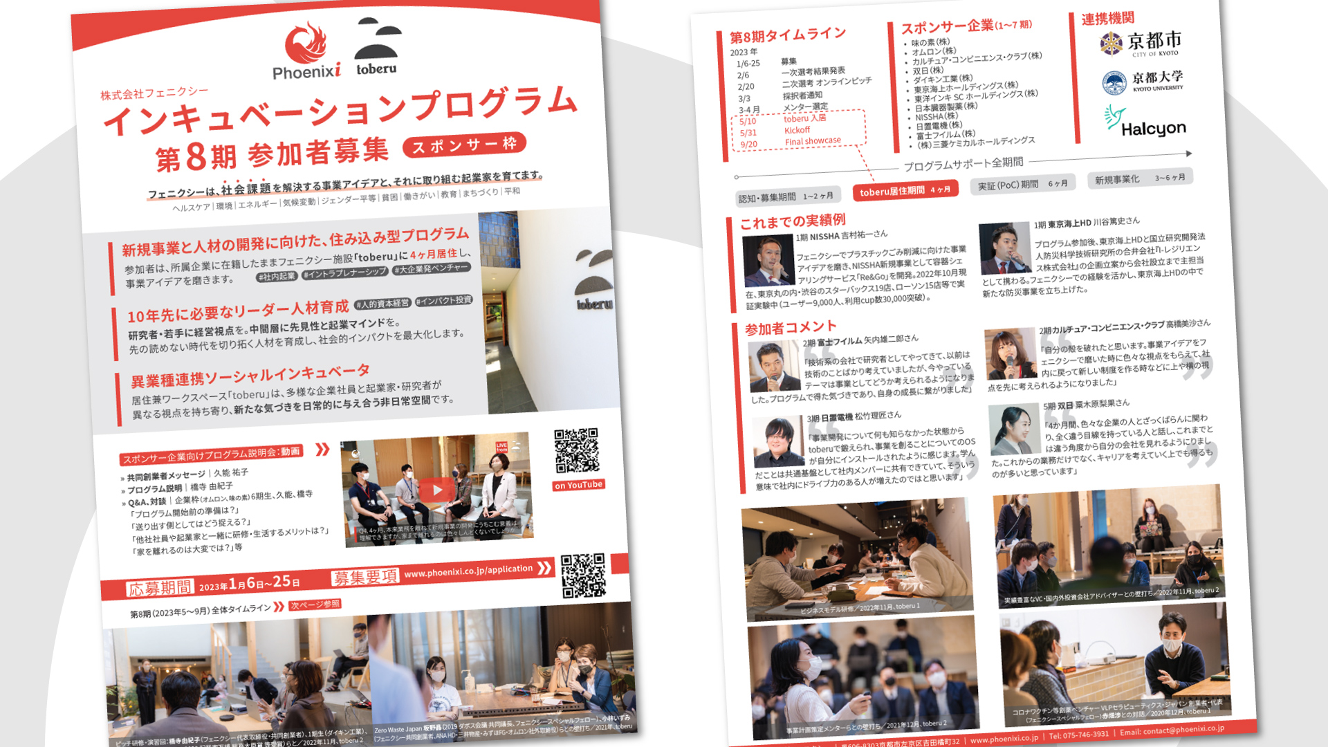 株式会社フェニクシーは2023年1月6日から2月3日まで、同社インキュベーションプログラム第8期(2023年5~9月)スポンサー枠への応募を受け付けています。
