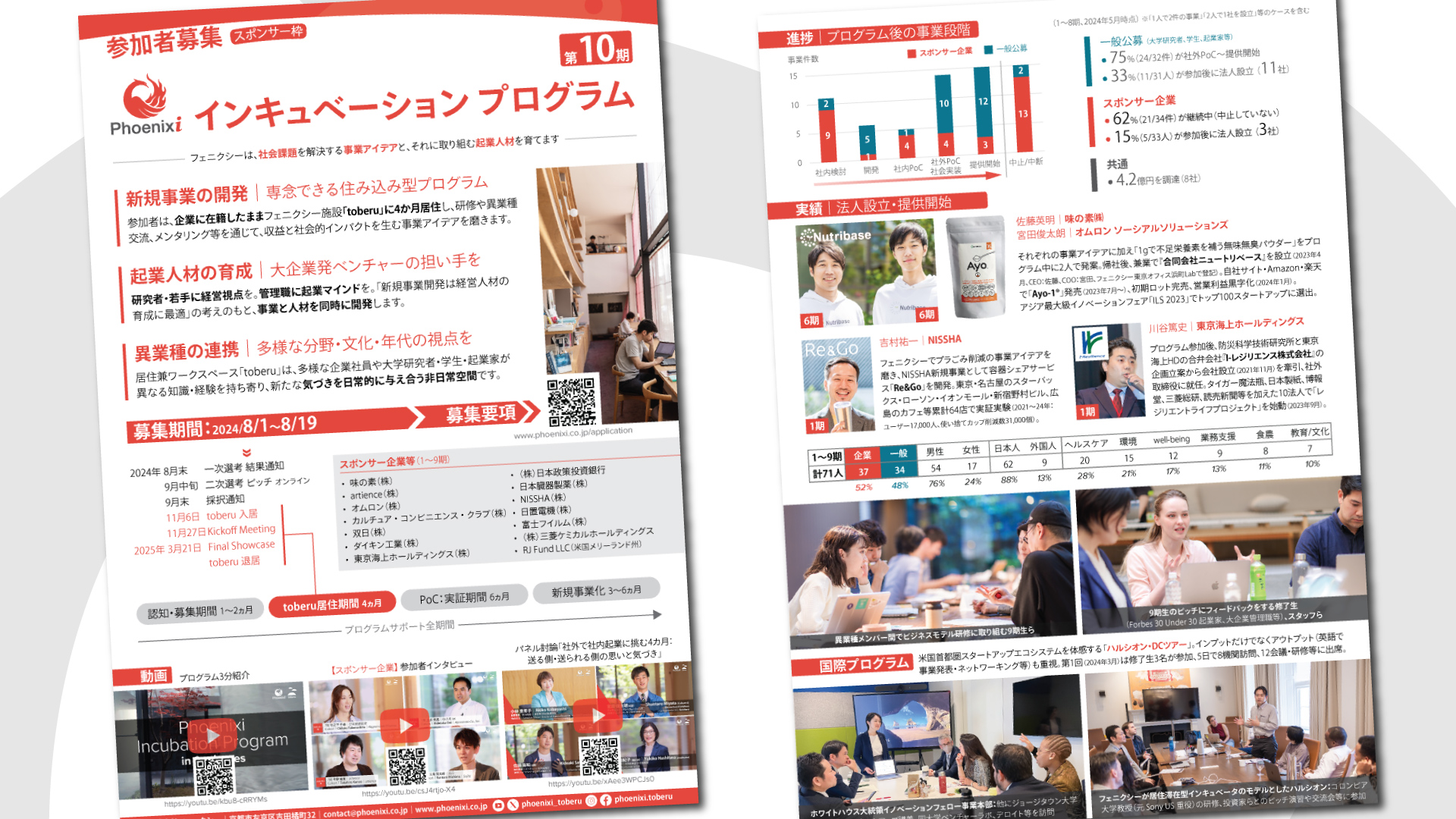 株式会社フェニクシーは2024年8月1日から、同社インキュベーションプログラム第10期(2024年11月~2025年3月)スポンサー企業枠への募集を開始します。